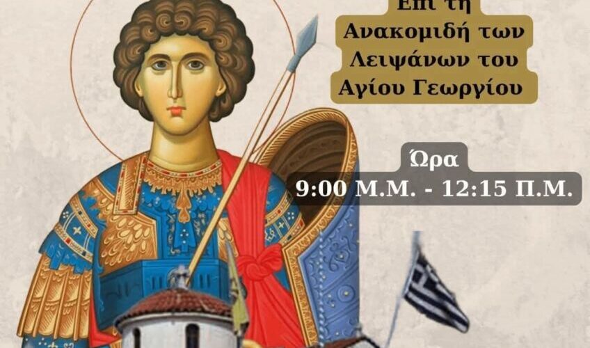 Ο Ιερός Ναός Αγίου Γεωργίου Λευκώνα ανακοινώνει την τέλεση Ιεράς Αγρυπνίας, Δευτέρα 3 Νοεμβρίου, επί τη εορτή της Ανακομιδής των Λειψάνων του Αγίου Γεωργίου.